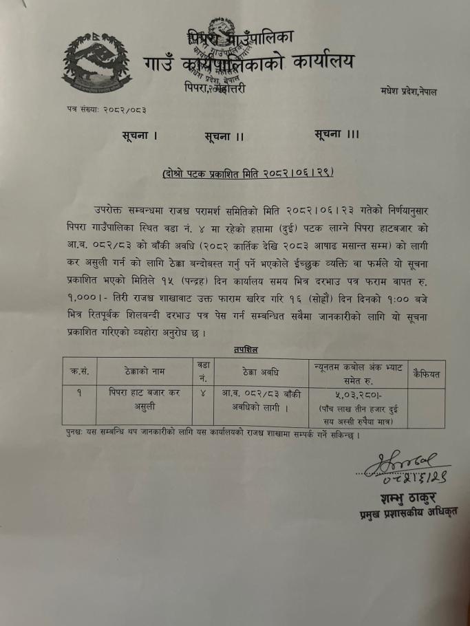 पिपरा हाटबजार ठेक्का समबन्धमा